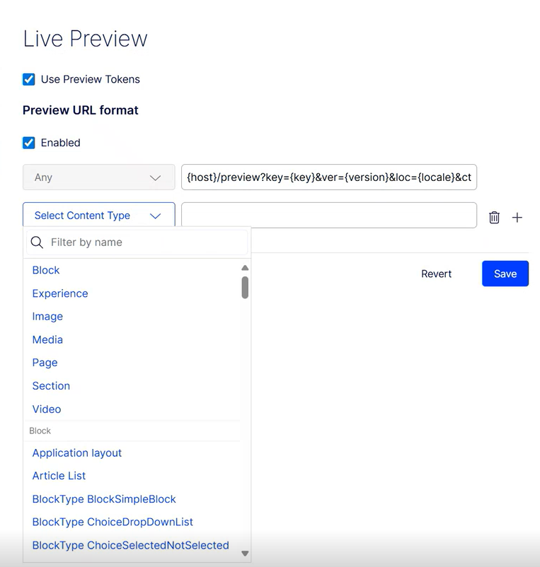 Add (+) – Click to add a selected Content Type row with a custom URL. Any is the default. If you remove the URL, you can preview only the items you specify.