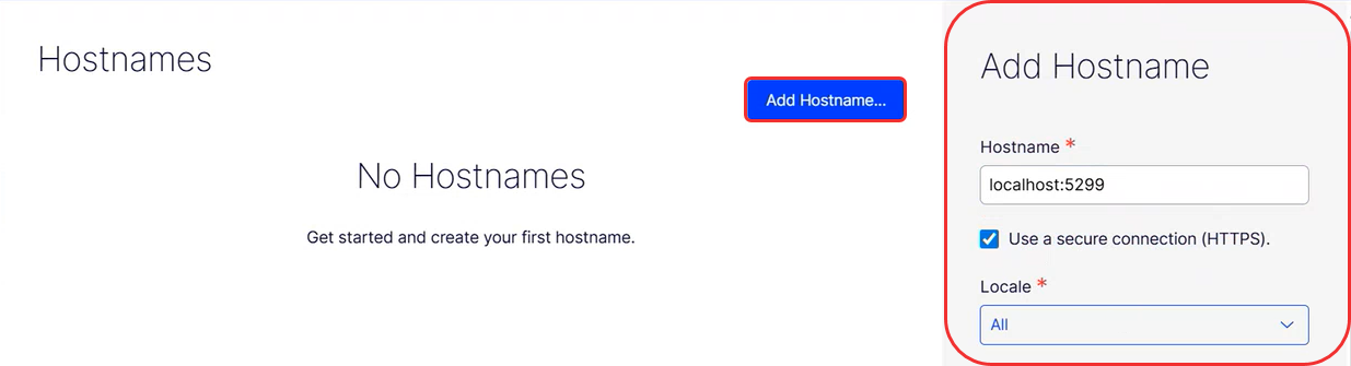 - Only one hostname can be primary per locale. If the selected locale already exists for another hostname, you are asked to confirm that you want to change the primary hostname for the selected locale. For example, if Oldtown has a locale of English (