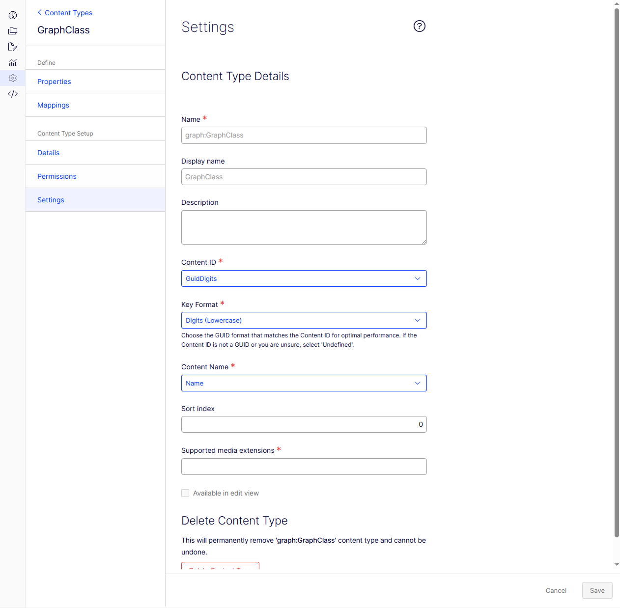 Connected content types are read-only in most areas because they mirror the schema from the external source. Administrators can update limited settings such as the following: