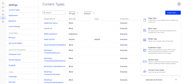 When you connect a schema from Optimizely Graph, CMS creates a connected content type. Connected content types appear in the Content Type list together with regular CMS content types.