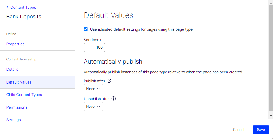 Sort index – Enter a number to determine the (ascending) sort order for content types listed on the Content Types page.