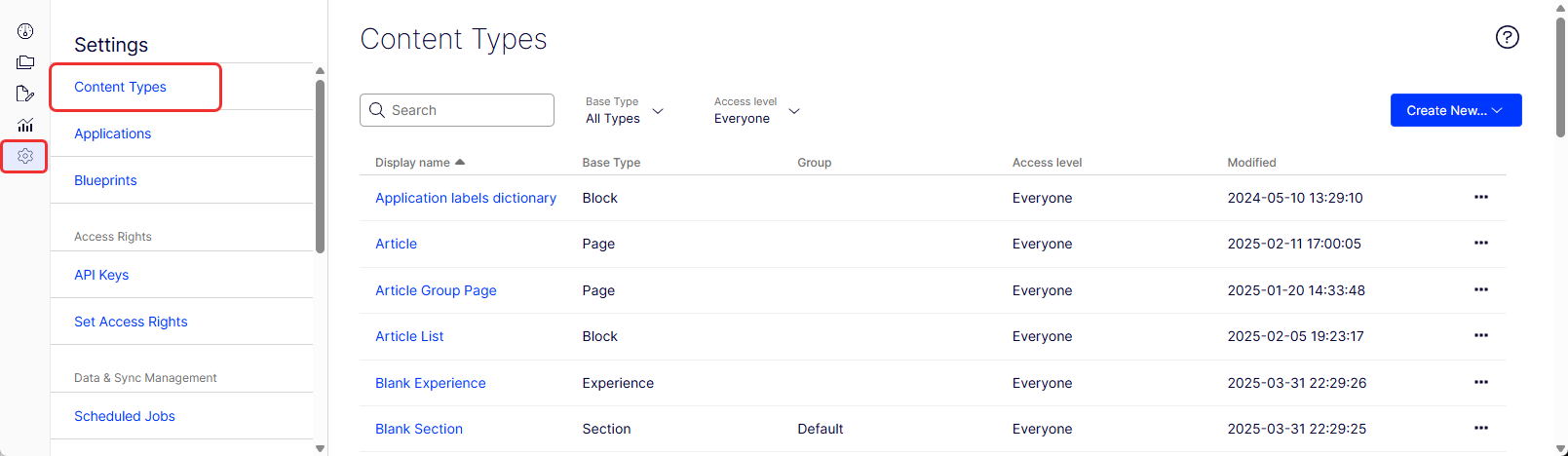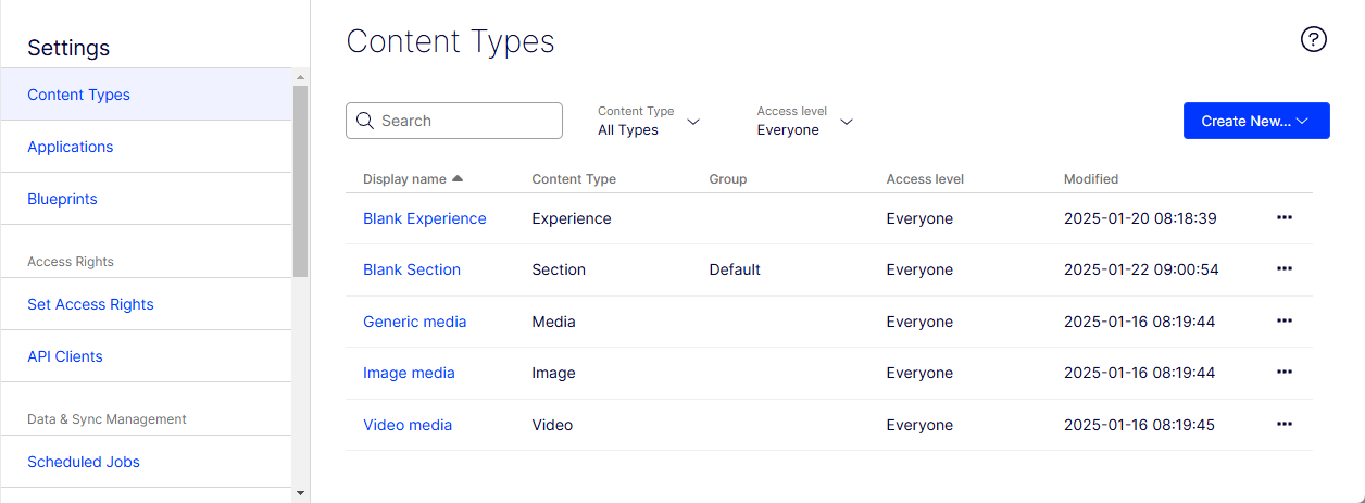The main structure models for content types are Page, Block, Media, Experience, and Section. Media types are items such as Images, Video, and other Media content. To create a content type, go to Settings > Content Types > Create New > {select the content type you want}.