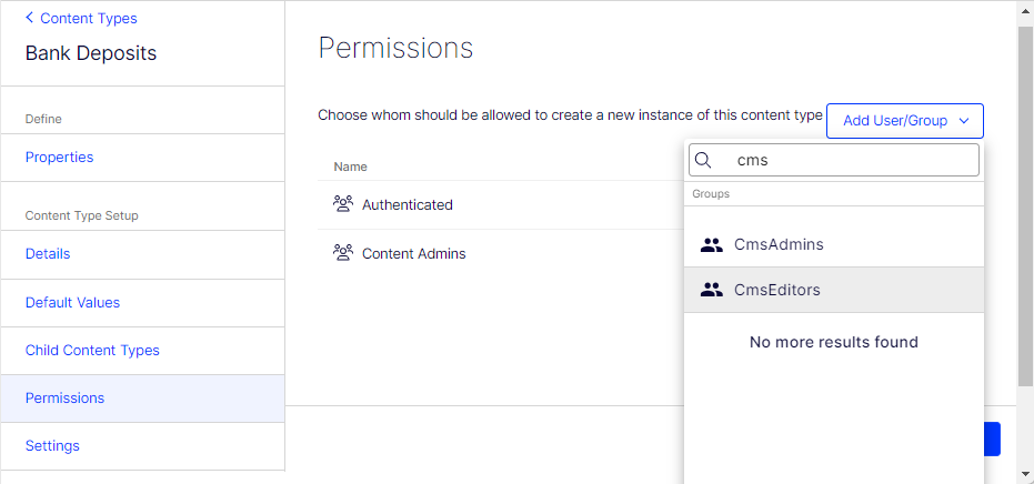 The following example shows how to make the News Page page type available to only some users to ensure that only authorized users can create news articles for the organization.