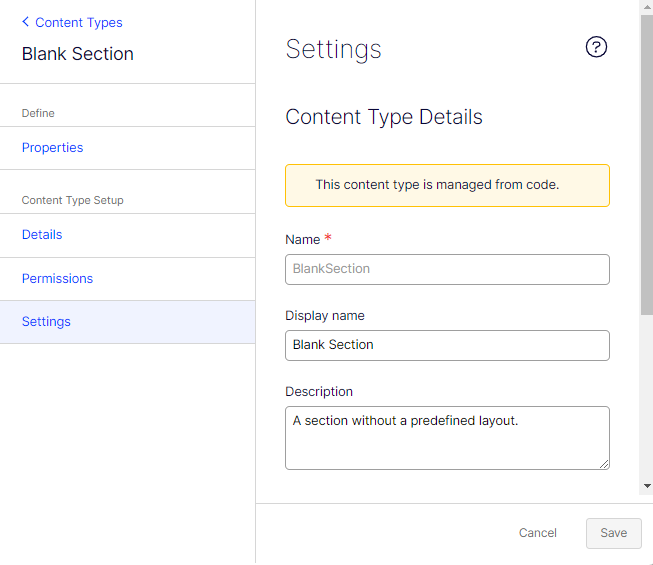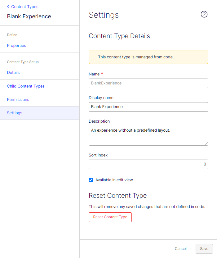 An experience type is an extension of the page type, enhanced to be used with Visual Builder. Because it is managed by Optimizely, you cannot adjust the Settings, but you can modify Permissions and other properties, similar to changes to page types described in Create a page type from the Settings view.