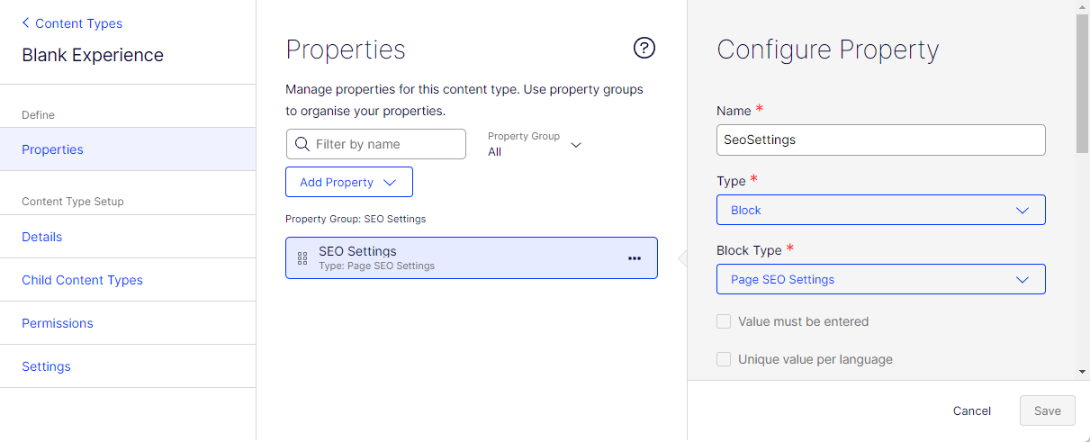For example, the Blank Experience content type has a single property called SEO Settings, which is a Block property with the specifications of the Page SEO Setting block Type.