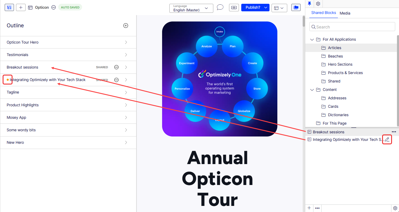 You can drag a shared block into a Visual Builder experience. Unpublished shared blocks show icons to indicate they are not yet published.