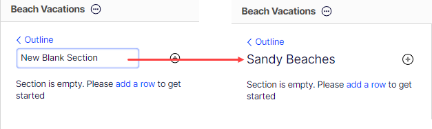 Visual Builder creates a New Blank Section, which you can rename by clicking the name and entering another name. (You can also select More (...) > Rename.)
