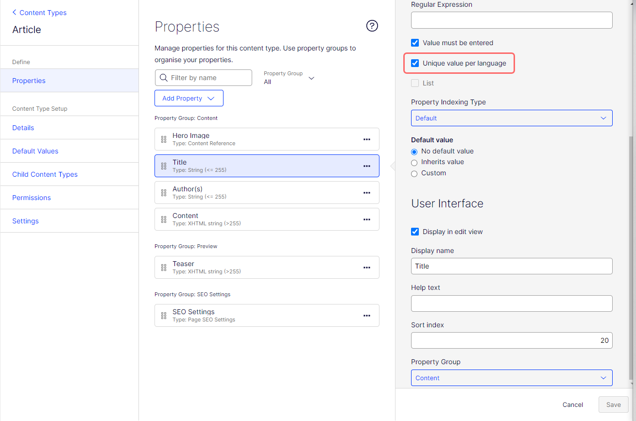 By setting the Unique value per language property, Optimizely Content Management System (CMS) (SaaS) knows to retrieve and display the correct language-specific value depending on one of the following factors: