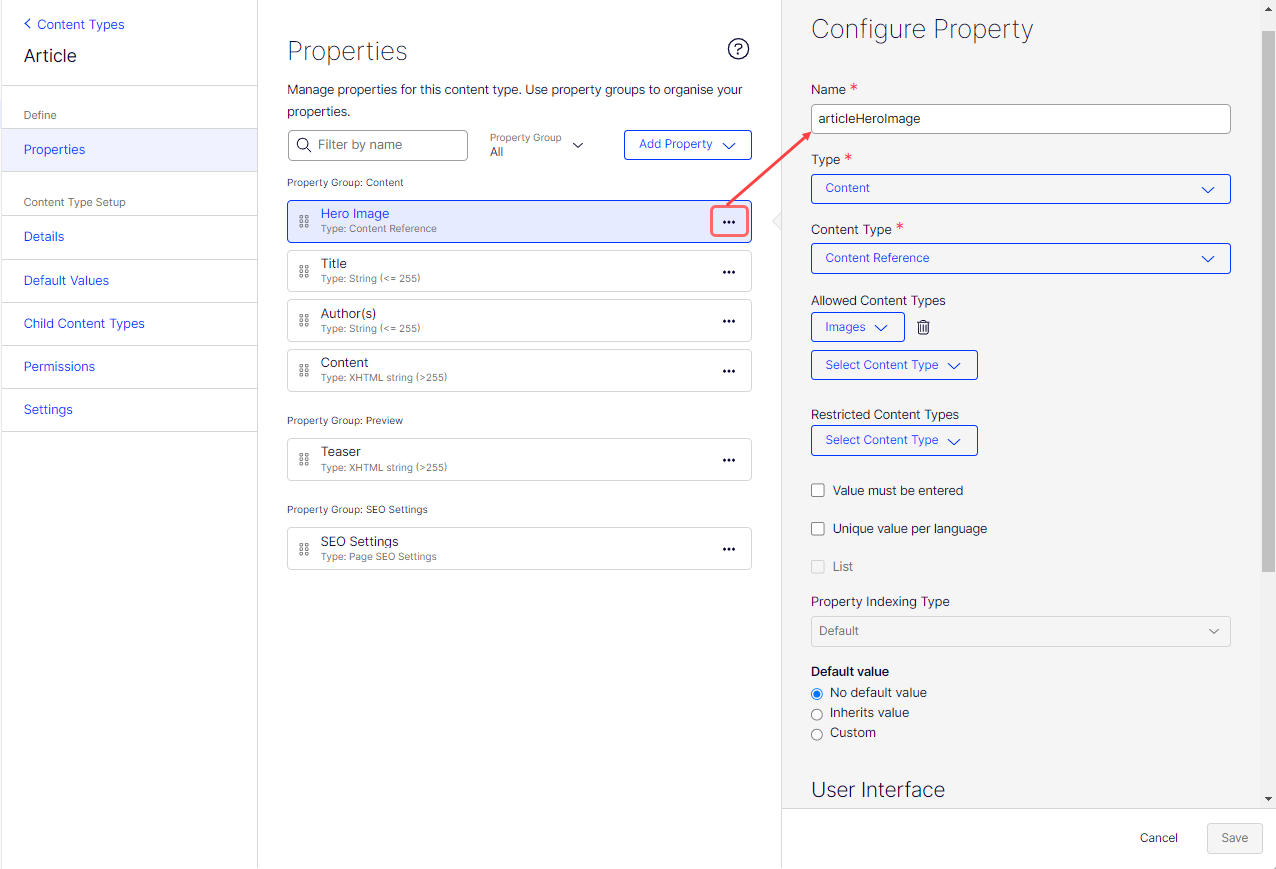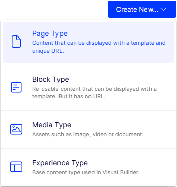 You can create different content types (Page, Block, Media, Experience, Element) by defining combinations of properties. To work with content types, go to Settings > Content Types > [select content type] > Properties.