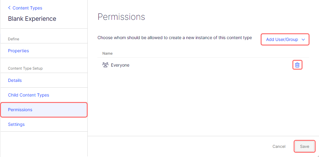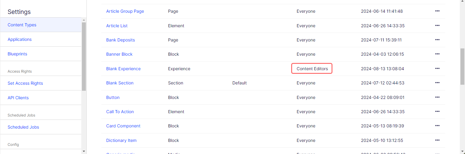 When a user tries to Create an Experience, the Blank experience content type is visible and available only to users in the Content Editors group.