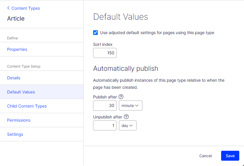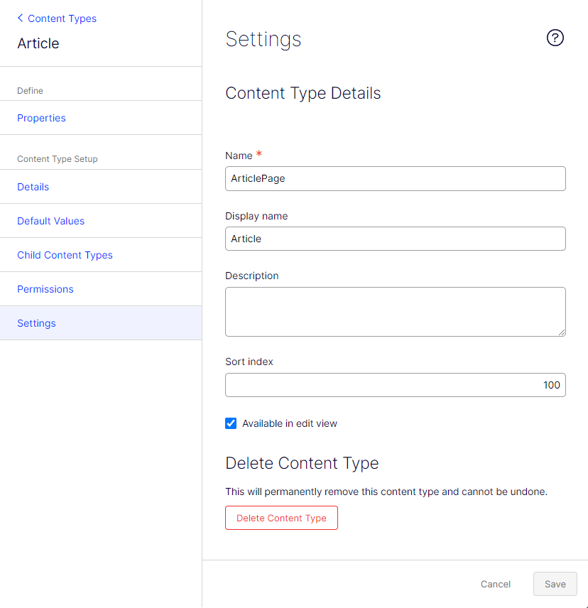 Sort index – Manually set the Sort index value for this page type. The sort index for a content type controls the order in which content types are listed on the Content Types page.