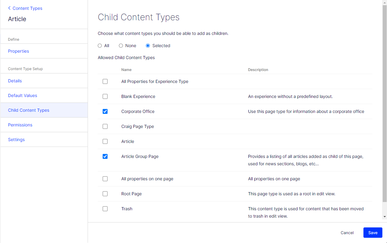 For example, perhaps you want the Article content type's children types to be limited to Corporate Office and Article Group Page.