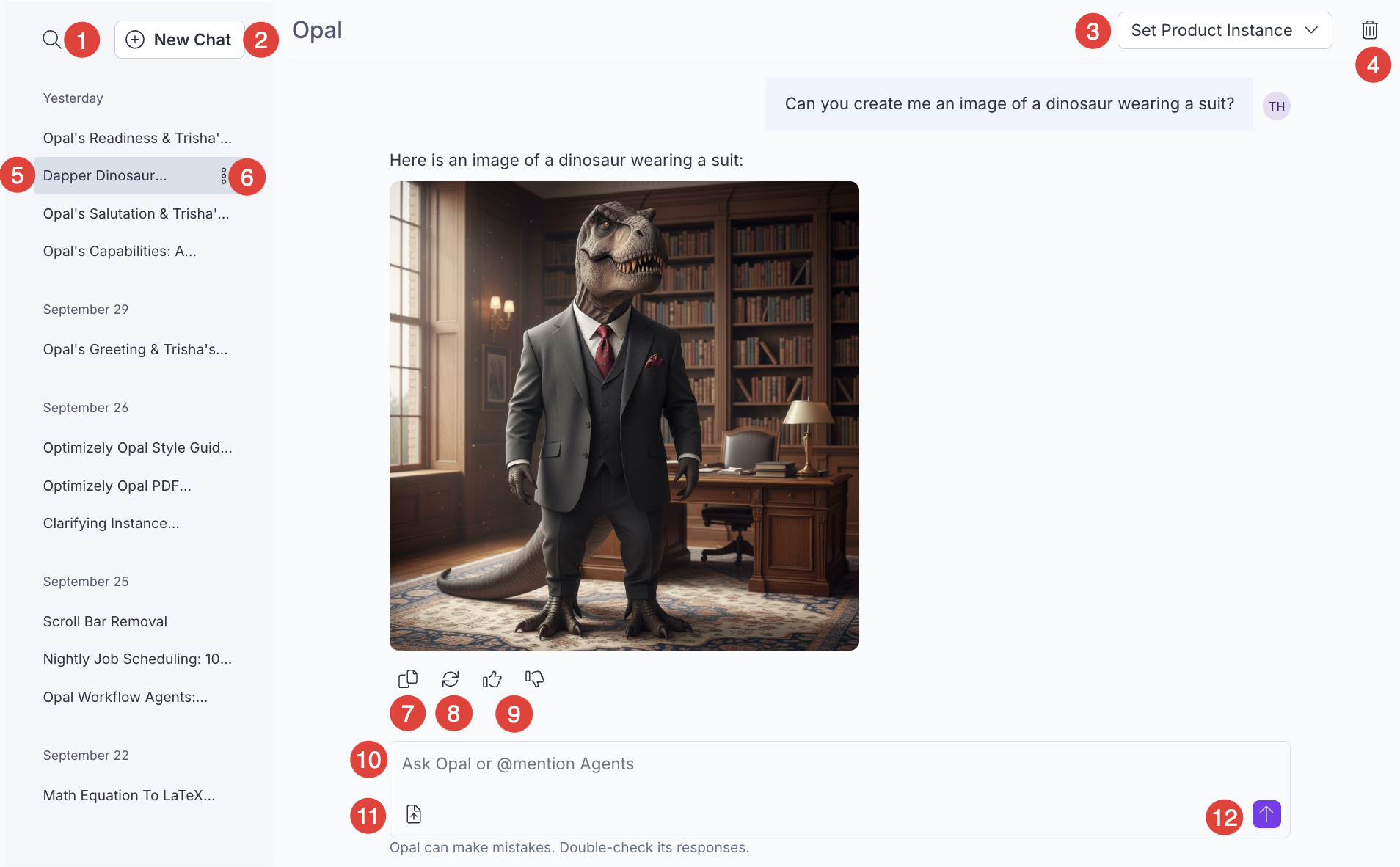 - Delete chat history – Clear the chat history window on the current chat. This button does not display until you send Opal a message. You cannot retrieve deleted chats.
