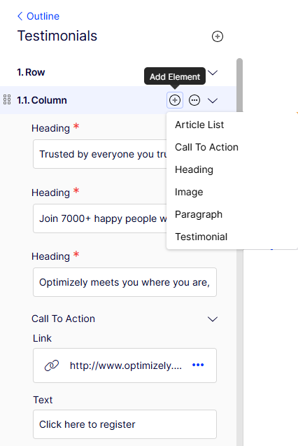 An element can be as simple as a Heading with a single text input field or more complex, like the Testimonial element with various optional and required fields with customer names, locations, pictures, and text.