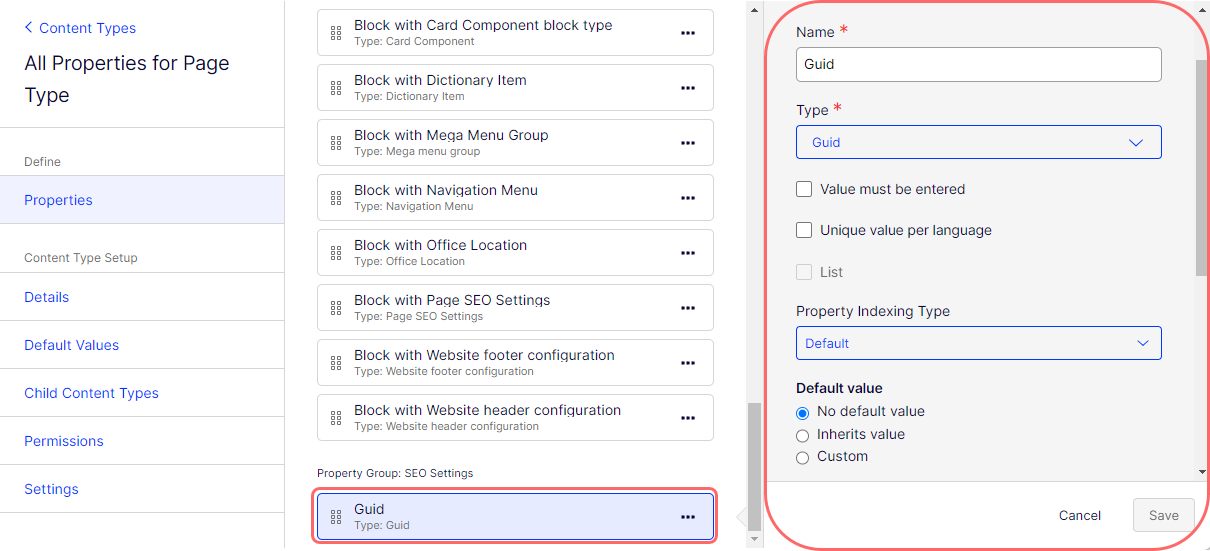 This topic describes the attributes of the Guid property type, which stores GUID values. The following image shows a Guid property type example.