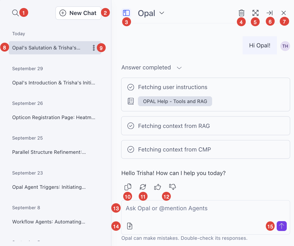 Delete current chat – Clear the chat history window on the current chat. This button does not display until you send Opal a message. You cannot retrieve deleted chats.