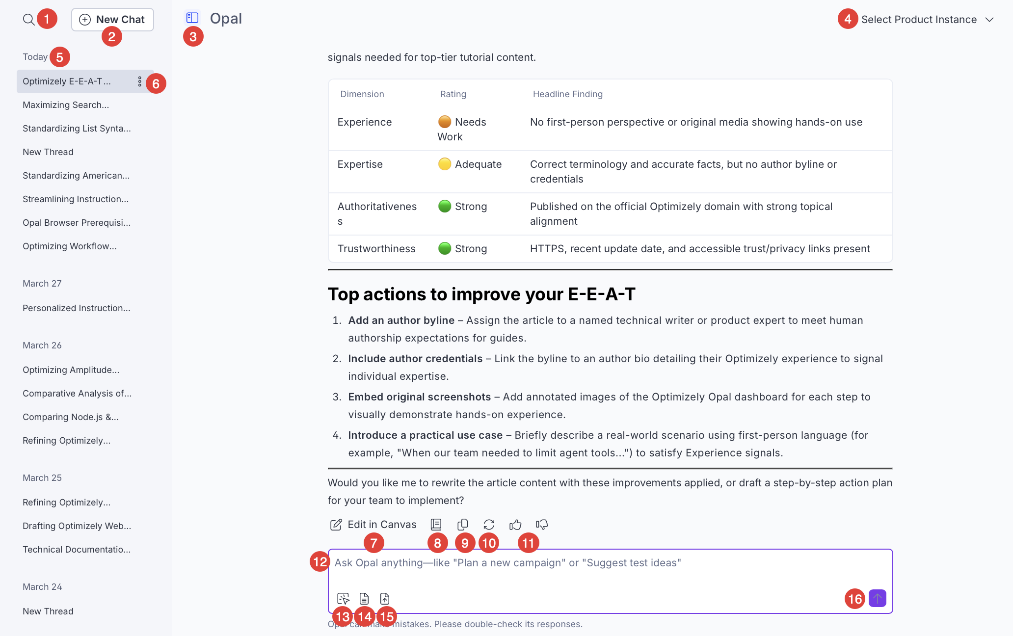 Chat history – Go to previous chat threads with Optimizely Opal.