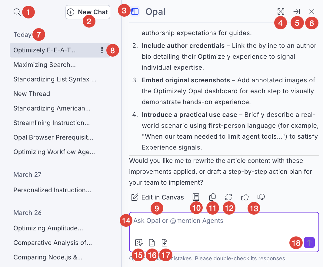 New Chat – Start a new chat thread. You should start a new chat when switching topics to keep Optimizely Opal's responses focused and your chat thread history focused on the topic.