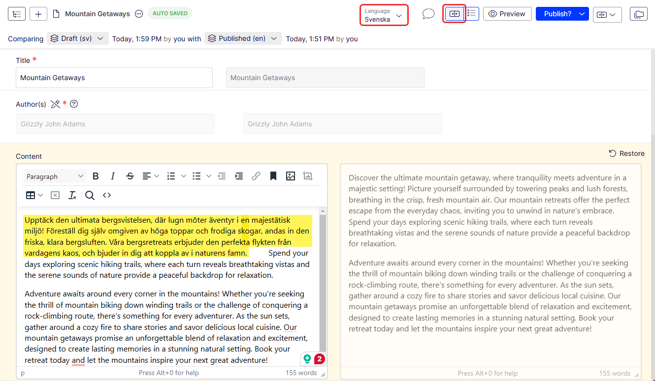 Click Compare view to translate in one panel while simultaneously seeing the original version in the other panel. The following image shows manual translation in Compare different versions view.