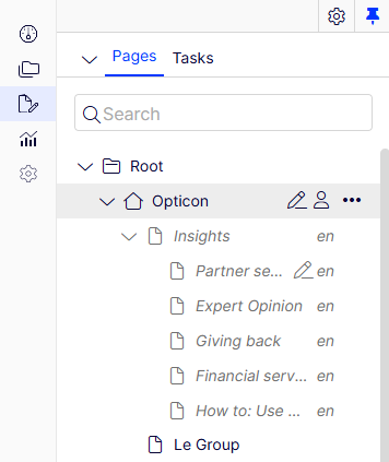 NoteWhen you only show content in one language, you can move pages to another location in the page tree structure by drag and drop or copy and paste, but you cannot sort pages. Sorting is disabled because sorting in one language, where you may not see all pages, can cause unexpected results in other languages.