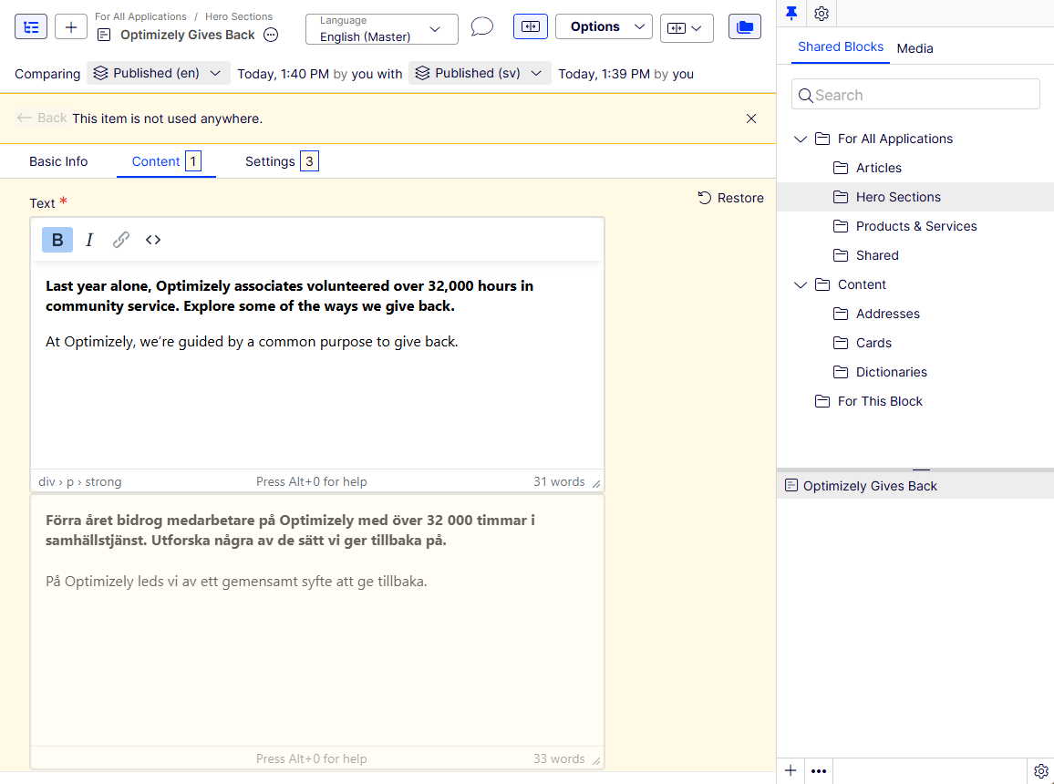 Edit the content and follow the content publishing flow to save and publish the translated shared block.