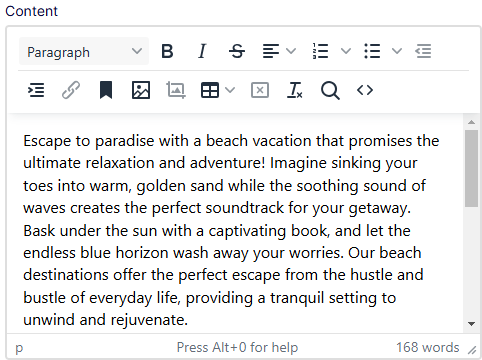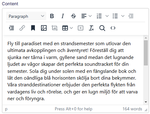 To create your own translation of the content, clear Translate content using AI in the Add Language dialog box. The content is copied to a parallel page tree for the language you selected. For example, The Mountain Getaways page was created in English. When you switch to the Swedish version, you start with the English copy that you can manually translate.