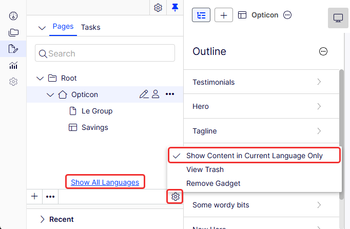 To view only translated pages, select Show Content in Current Language Only from the page tree's Settings button. This filters out other language versions. You can also use this option in the assets panel and the Versions gadget to view shared blocks and versions only in the current language.