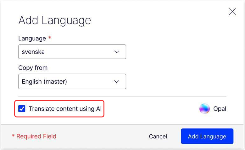 Select the language, and if you want to automatically translate the shared block's content, and click Add Language. Selecting automatic translation translates the shared block content.