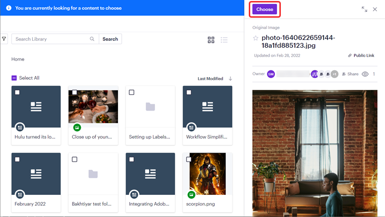 You can select one or more assets. The metadata is displayed if you select only one asset, as shown in the following image. Click Choose to finalize the selections.