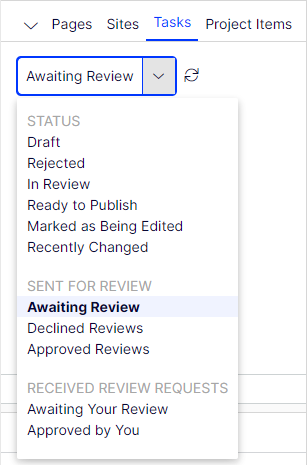 Use Tasks in the navigation panel to keep track of the content items you have sent for review, items waiting for your approval, or items you have already approved.