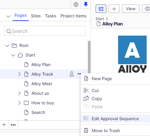 The approval sequence overview is opened from a page's or assets folder's More menu: