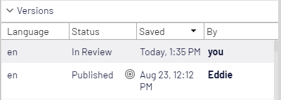 When a content item is in review, its status changes to In review in the Versions gadget. It is locked for editing until it is approved in all steps of the approval sequence. When it is approved in all steps, it is set as Ready to Publish, and you are notified of this in the user interface and by email. The Versions gadget shows In review status