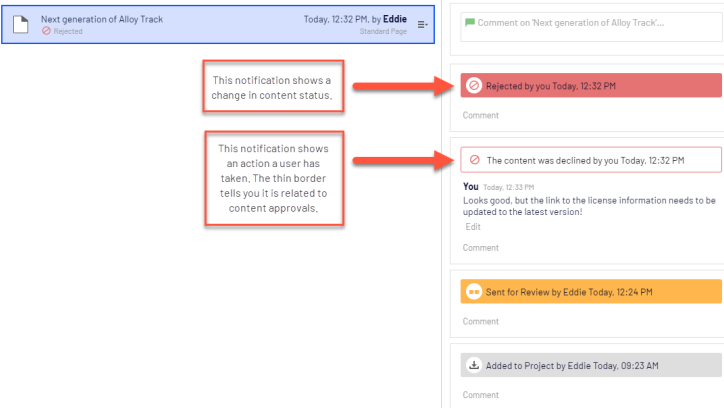 When approving or declining content, and depending on your system configuration, you may have to give a reason for your action. Your comment is visible in the user interface and email notifications to the person who started the content approval sequence. It is also displayed in the project overview, if the content item in review is associated with a project.