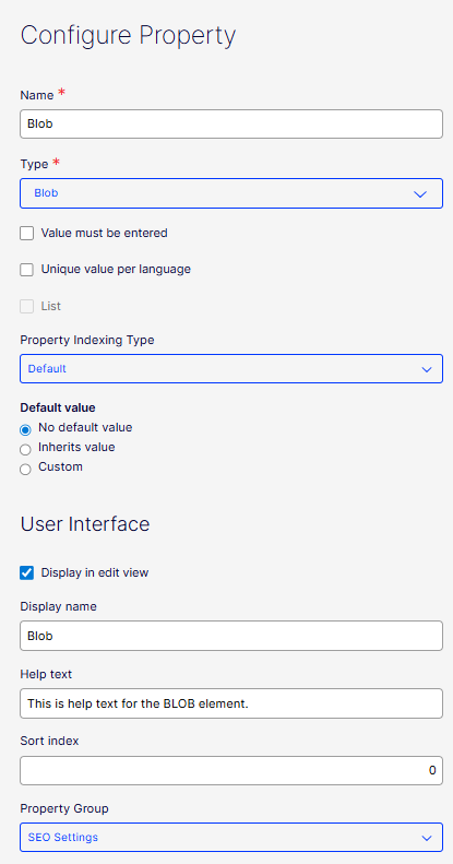 This topic describes the attributes of the Blob property type, which stores binary large object (BLOB) data, such as files, images, or serialized content that does not fit into standard scalar types. The following image shows a Blob property type example.