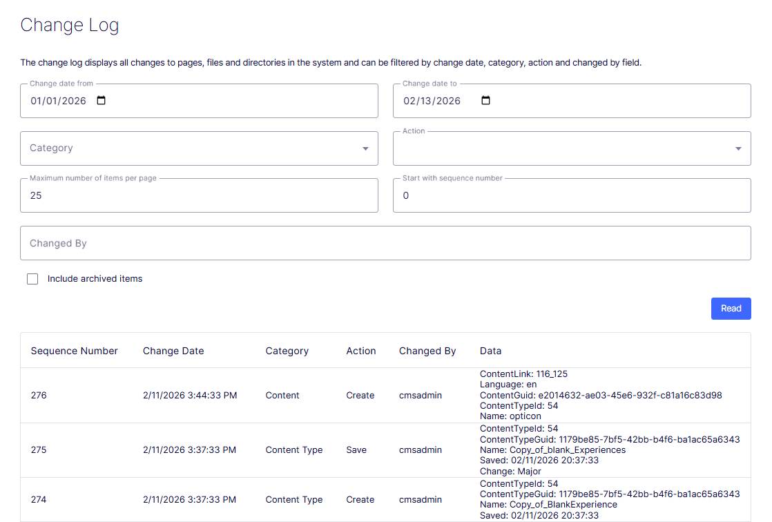 - Changed by – To filter for a specific user, enter the Optimizely CMS user name.