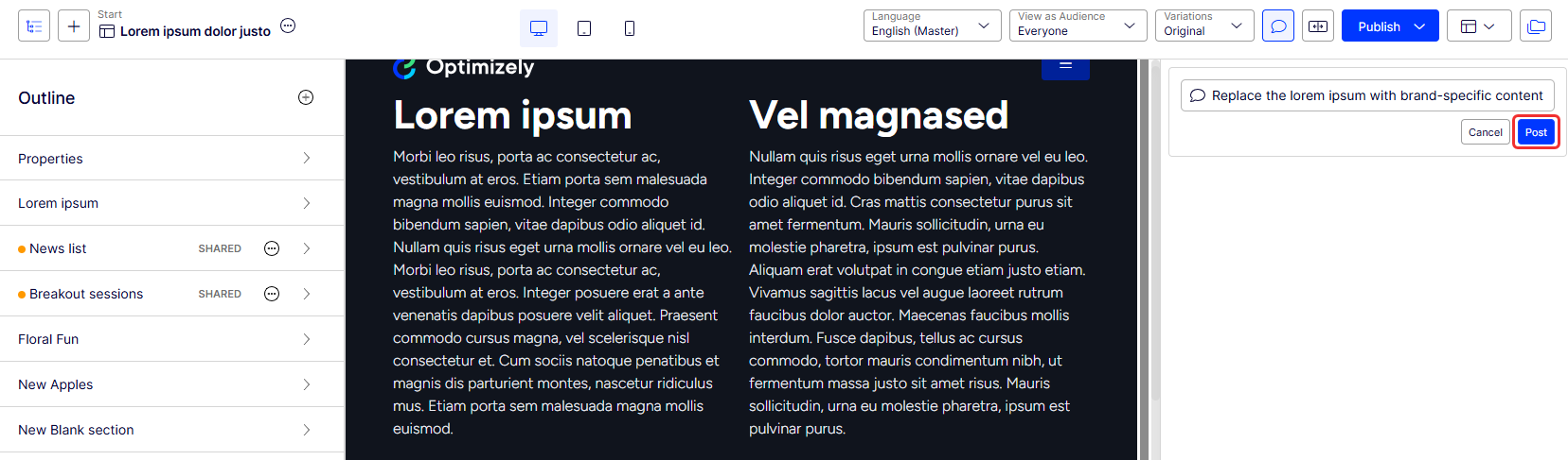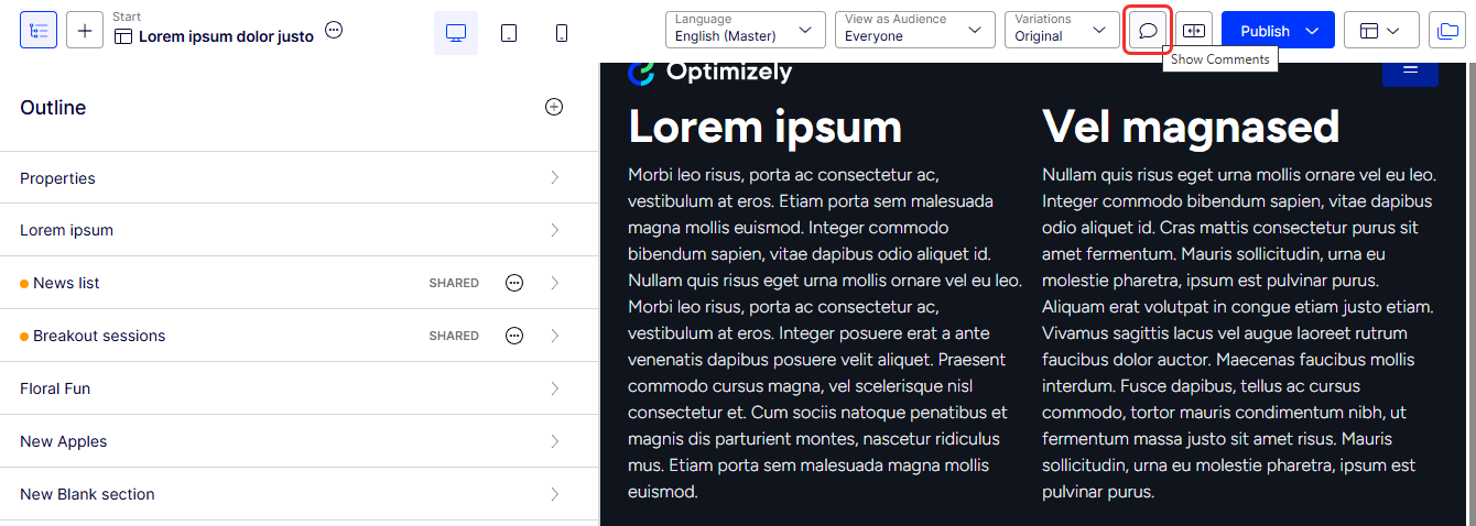 Enhance collaboration in Optimizely CMS 13 using commenting features. Add, edit, and reply to comments on content items and projects, and tag colleagues for review.