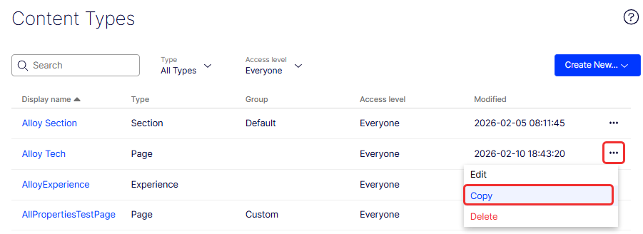 When you copy a page type, its properties are also copied. You can then edit the information for the page type and its properties. Copy a page type as follows: