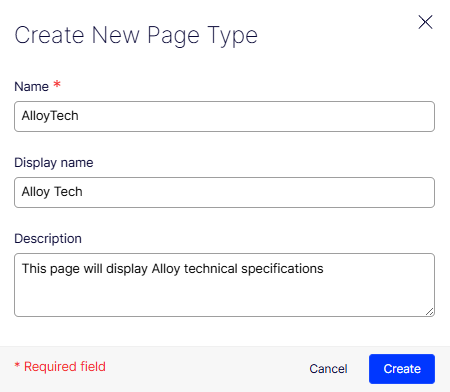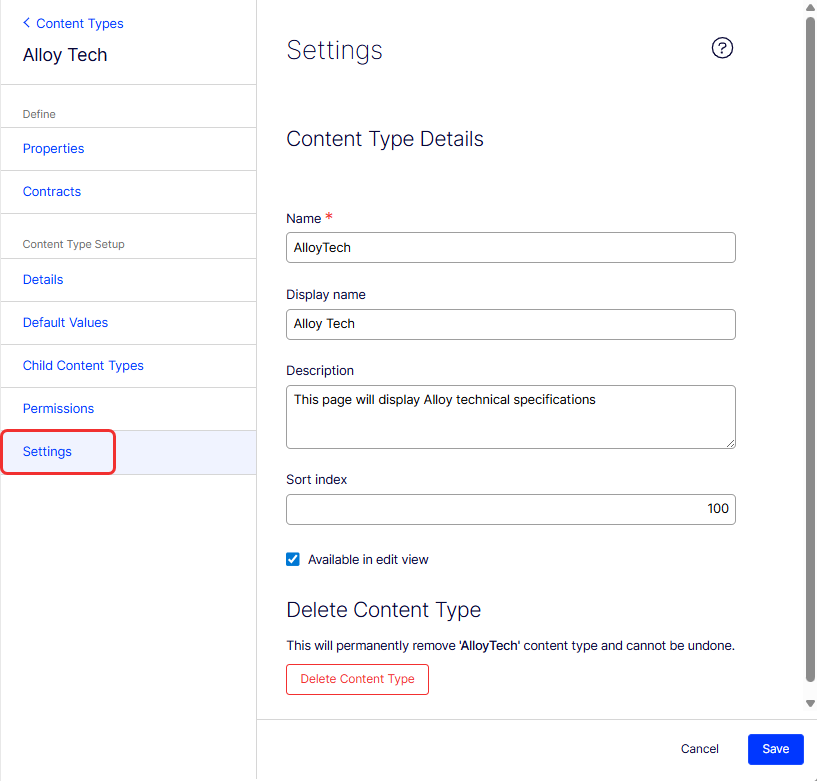- Description – This field provides a brief explanation of the content type's purpose or its intended use. The description in the image is This page will display Alloy technical specifications.