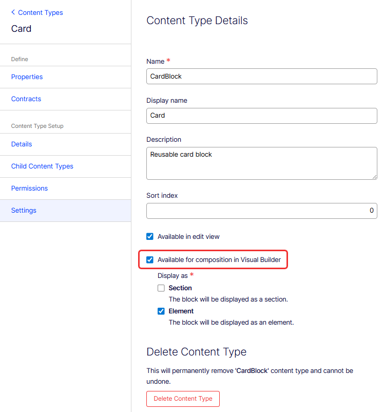 An Experience content type is an extension of the page type, enhanced for use with the Visual Builder. To create one from the Settings view: