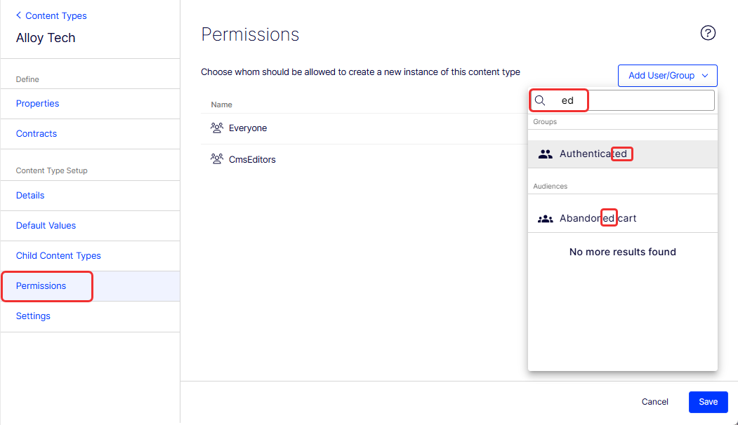 - Save the content type. When you select a contract as the reference type, the content picker in the editor surfaces all content types that implement that contract.