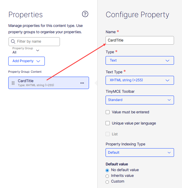 Select Properties and specify the components of your block type. For example, the CardTitle content type has a Text property, which is further defined as an XHTML string (>255) in the Configure Property panel.
