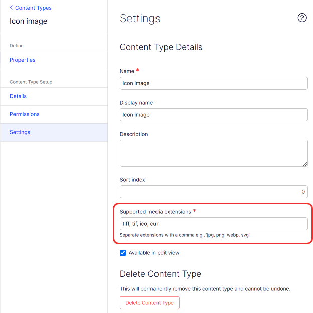 Sort index – Enter a number to determine the (ascending) sort order for content types listed on the Content Types page.