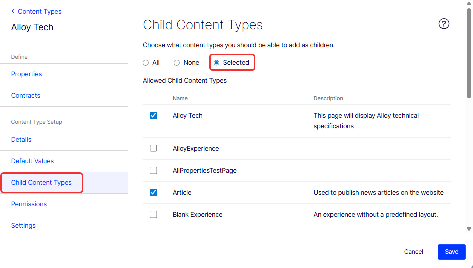 When creating pages, limit the available page types in the page type list to make it easier for editors to choose the correct page type. For example, for an Alloy Tech parent page, select Selected and then specify that the only available page type is Alloy Tech or Article.