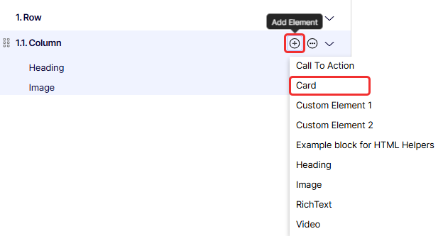 If you selected Available for composition in Visual Builder in the content type settings, when you click Add Element in a Visual Builder Outline, the block type—for example Card—is listed among the selections.