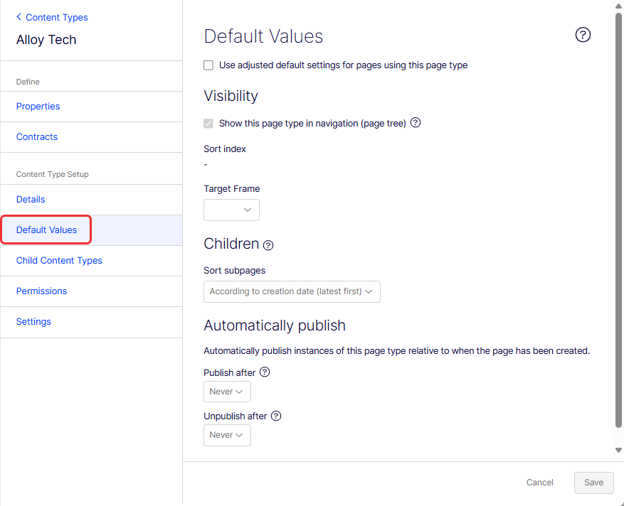 - Use adjusted default settings for pages using this page type – Select to enable or disable adjusted default settings for pages created with this page type.