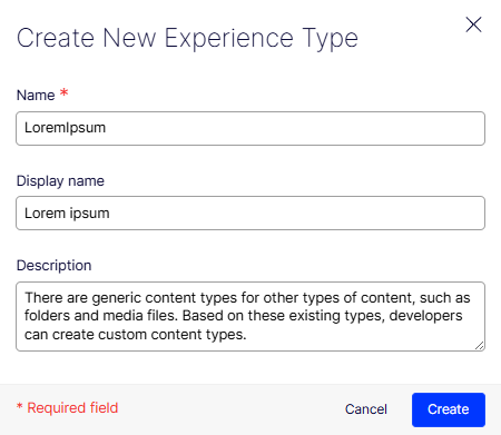 Complete the following fields: * Name (required) – Enter a unique identifier for the content type (for example, LoremIpsum). This is the internal key used by the system.
