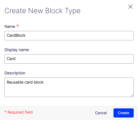 Go to Settings > Content Types and click Create New > Block Type. The Create New Block Type window displays.