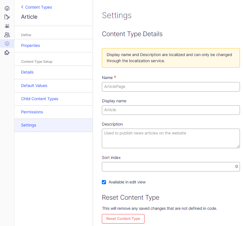 - Reset Content Type – Click to discard any changes made to the content type that have not been defined in the underlying code, reverting it to its default, code-based configuration.