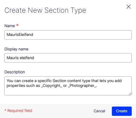 Click Create to save the Section content type.