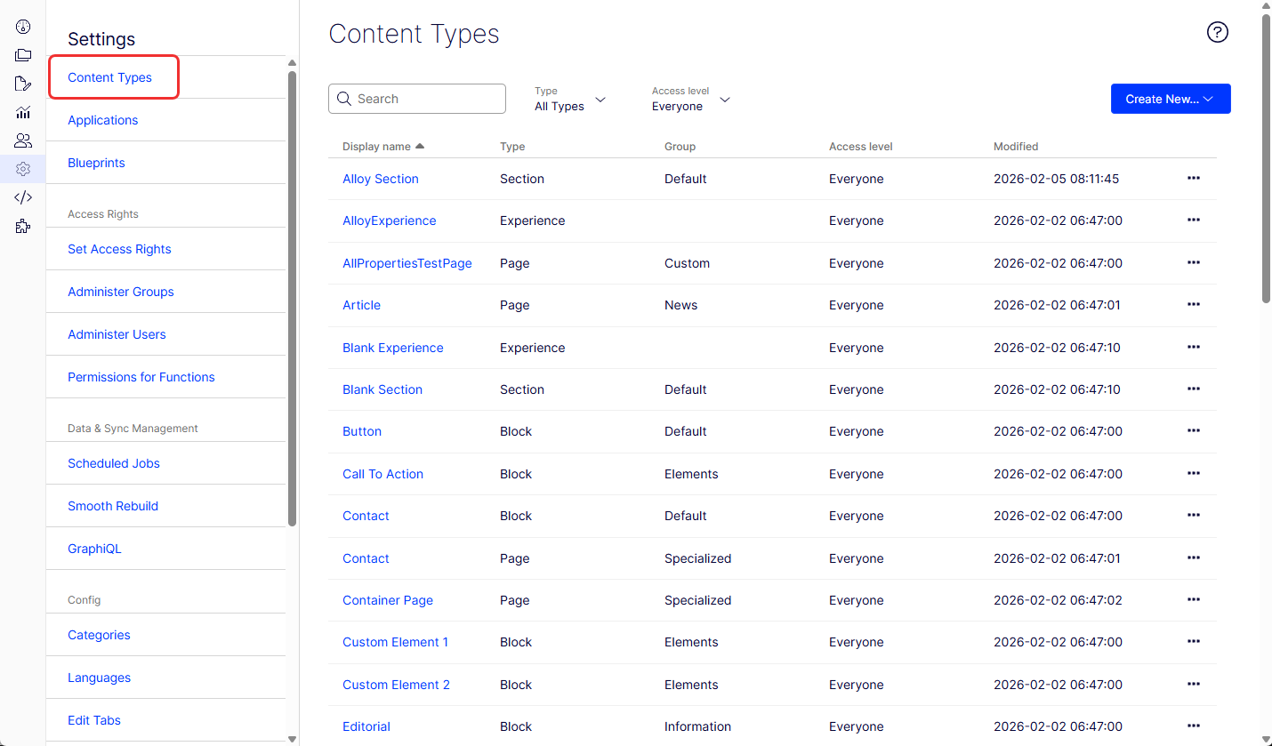 Administrators and developers manage content types in Optimizely CMS 13. Create, edit, and configure page, block, and media types, including properties and permissions.